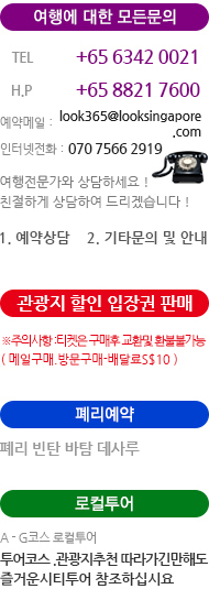 »óÈ£¸í : Look Singapore Tour Pte. Ltd.   ´ëÇ¥ÀÚ : ±èÇö±æ   TEL : +65-6342-0032   FAX : +65-6348-0032   Company e-mail: admin@looksingapore.com